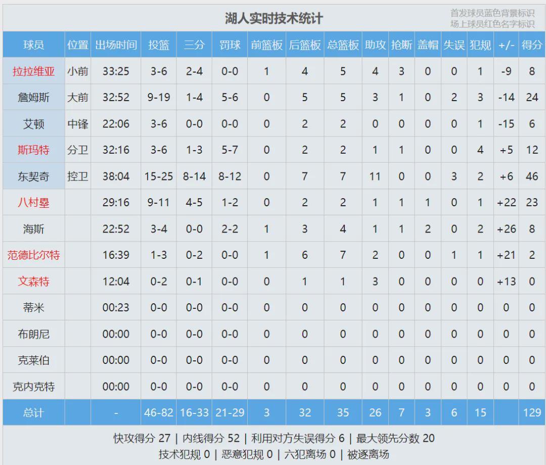 今天西部第4的火箭也赢球了,湖人继续排名西部第5。东契奇25投15中,三分14中8,罚球12中8,狂砍46分7篮板11助攻。詹姆斯24分5板3助,下半场投篮4中0,依靠罚球拿到4分。八村塁替补出战29分钟,11中9得到23分2板。