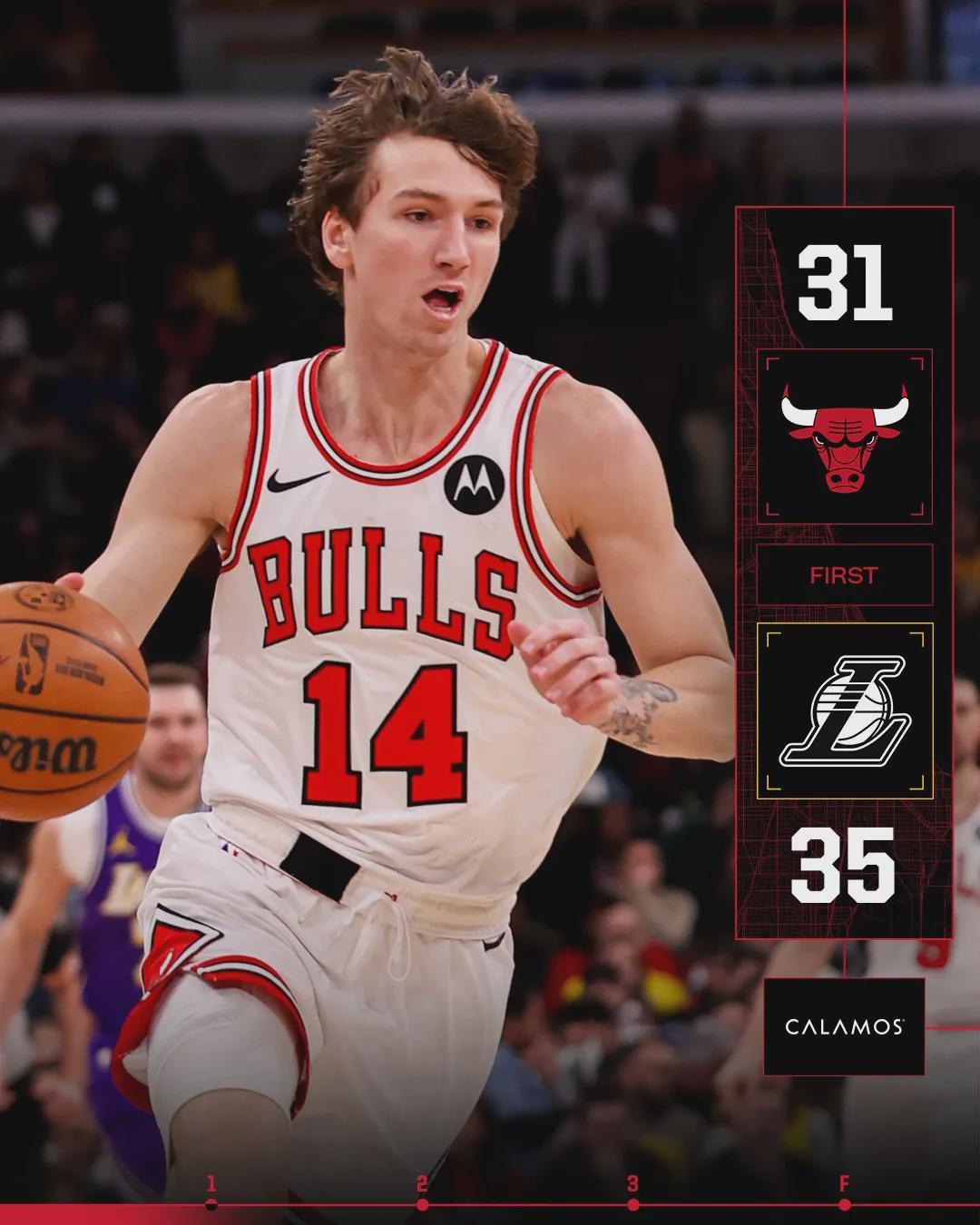 公牛本来防守就不行,上半场打得更是毫无活力,根本没人退防。好在公牛第一节命中不错,杰伦-史密斯单节4中4砍下10分。第一节打完,湖人35-31领先公牛4分。第二节詹姆斯带着湖人替补扩大领先优势,詹姆斯单节再砍12分。