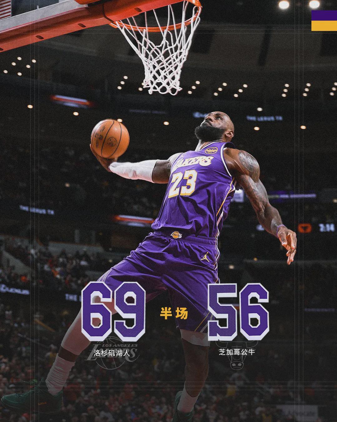 第二节公牛10次失误,有点辣眼睛了。上半场湖人利用快攻得到20分,比公牛多一倍。公牛三分够准,上半场三分球22中10,所以比赛没有打花。上半场打完,湖人69-56领先13分。詹姆斯15中9得到20分,东契奇10中6得到17分。